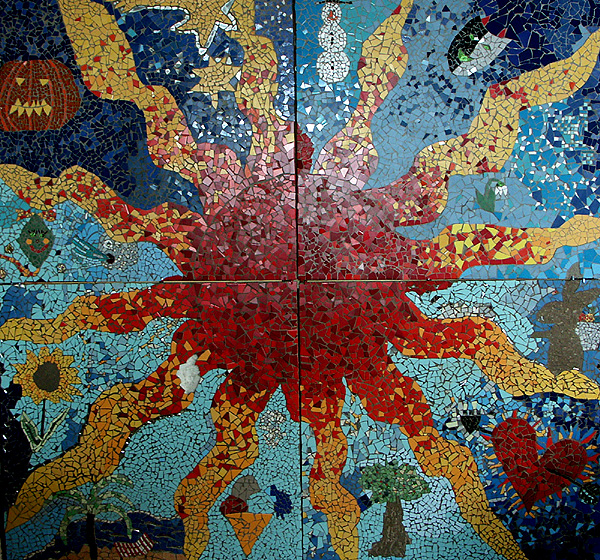 Sonnenmosaik. Entstanden innerhalb der Sommerferien als Familien Projekt, Eltern mit Kindern gestalten mit uns, Mirella Begue Grange und W.W.Gutzler, ein Mosaik, im Biergarten des Bistro Detail 2 in Rommelshausen. Grösse 2,60x2,70 m. Das fertige Mosaik wird dann als Bildwand im besagten Biergarten vor einer etwas unschönen Garagenrückwand installiert.